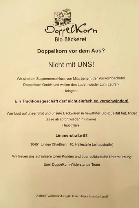 Doppelkorn soll dicht machen? Nicht mit uns, haben sich einige der Mitarbeiter der traditionsreichen Vollkornbäckerei in Hannover gedacht, und seit heute, 9. August 2017, die Türen ihres Hauptgeschäftes in der Limmerstraße 58 wieder geöffnet.