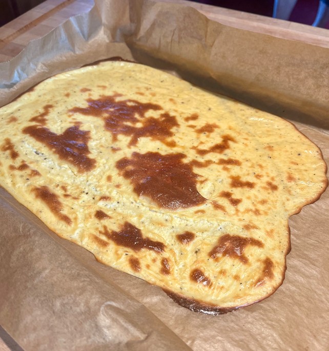 Vielleicht wird das Fetabrot besser? Ein Block Feta, ein Ei und 60g Mehl mit etwas Wasser zu einem Teig verkneten. Ich habe noch einen Esslöffel Schwarzkümmel reingetan, weil‘s passt und ein tolles Gewürz ist. Der Teig wird jetzt auf Backpapier in Rechteckform gebracht und geschenkartig eingewickelt. 20 Minuten bei 200°C. Dazu koch ich mir ne Salsa. Damit kenn ich mich aus, da weiß ich, was ich tu:
