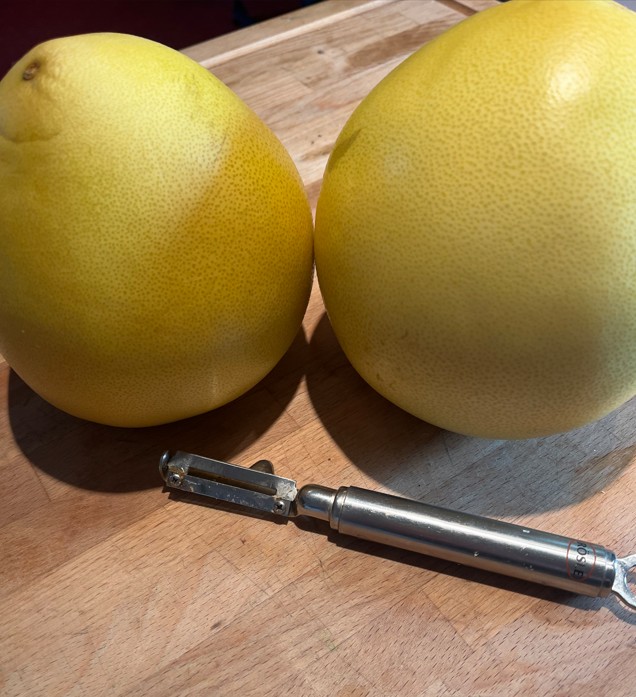 Zuerst mal: Heiß waschen. Aus Gründen (offensichtlich ist Umweltschutz keiner davon) sind Pomelos meist ja noch in Folie verpackt. Dennoch sollte jegliches Pesti-Herpi-Warzi-Plastikzeug von dem Obst gespült werden, damit man nicht aus Versehen etwas Ungesundes isst. Jetzt schön gereinigt, entfernen wir mit dem Sparschäler die gelbe Schale. Aber wirklich nur die gelbe – das weiße Gummizeugs brauchen wir noch an anderer Stelle. Die Schale kommt auf Küchenkrepp und für 5 Minuten in die Mikrowelle, bis sie schön knusprig ist. Mal durchbrechen – wow! Was für ein Aroma! Zermörsert oder in der Kaffeemühle gemahlen und pur oder hinterher mit Zucker oder Salz gemischt, ist das ein tolles Gewürz – und ein hübsches, kleines Geschenk!