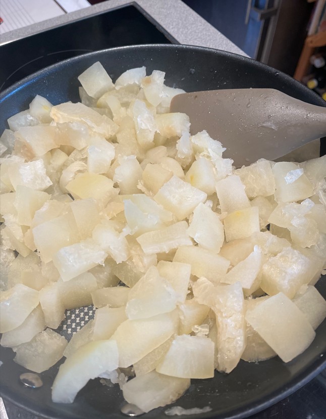 Nun geht’s dem weißen Zeug an den Kragen. Wie schmeckt das eigentlich im Rohzustand? Bitter! Trotzdem: Wir pulen es vom Fruchtfleisch ab und schneiden es in Würfel. Anschließend kochen wir die schwammartige Substanz etwa 8 Minuten lang. Dann ist sie gar – und noch schwammförmiger. Den ganzen Quatsch gießen wir durch ein Sieb ab und spülen anschließend noch zwei Mal mit kaltem Wasser durch, bis das zunächst hellgrüne Wasser klar bleibt. Jetzt sind die Bitterstoffe raus. Und wie man das mit Schwämmen so macht: Das Wasser will ausgedrückt werden. So bleibt nicht viel mehr als eine große Handvoll über, aber das ändert sich gleich wieder: Wir lösen 500g Zucker in 500ml Wasser auf und lassen die Lösung kurz sprudelnd aufkochen. Dann fügen wir die weißen Schwammstückchen hinzu und rühren eifrig. Prompt saugen die sich natürlich wieder mit dem Zuckersirup voll, aber das war auch der Plan. Sobald das geschehen ist, drehen wir die Hitze am Herd runter und lassen die Würfel langsam trocknen und karamellisieren. In regelmäßigen Abständen rühren, bis sie merklich schrumpfen und eine mattweiße Zuckerpatina annehmen.