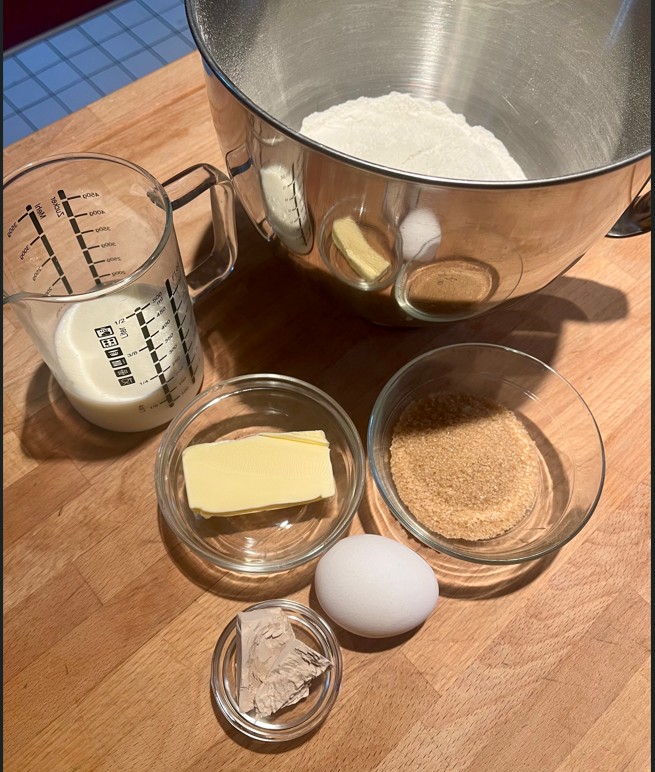 Ein halber Würfel Hefe, 400g Mehl, eine Prise Salz, 170ml Milch, 50g Butter, ein Ei und 60g Zucker werden zunächst gebraucht. Milch und Butter werden in einem Topf leicht erwärmt. Würdet ihr ein Baby darin baden? Dann ist die Temperatur gut. Aus den Zutaten wird jetzt ein Hefeteig geknetet, der dann an einem warmen Ort eine gute Stunde vor sich hinkolatscht.