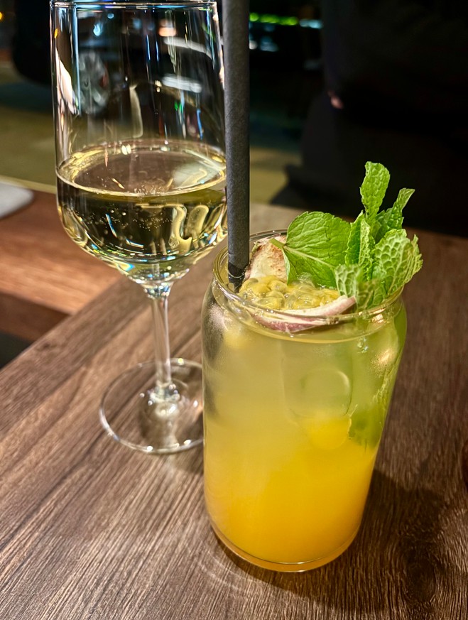 Optisch macht es schon mal einen guten Eindruck – sofern wir etwas erkennen können, denn es ist relativ dunkel hier. Allerdings nicht ungemütlich. Das Cham wirbt mit „nachhaltiger“ Küche und wir sind gespannt, was das bedeuten soll. Alle Gerichte sind vegan und Hauptbestandteil der meisten Angebote auf der angenehm dimensionierten Karte ist Tofu. Über die Nachhaltigkeit im Soja-Anbau sollte vielleicht noch einmal gesprochen werden, aber dieses globale Problem wollen wir heute Abend nicht wälzen. Die Karte empfiehlt, pro Person drei der kleinen Gerichte zu je 5,90 Euro auszusuchen. Es gibt zwar auch Bowls zu je 13,90 Euro, aber wir möchten so viel wie möglich entdecken. Zu trinken wählen wir einen Grauburgunder (8,50 Euro, 0,2l) und eine hausgemachte Maracuja-Limonade namens „Passionate Asian“ (5,90 Euro). Der Wein ist schmackhaft aber nicht über die Maßen beeindruckend, bei der Limonade sieht das schon anders aus: Die vorherrschende Süße wird durch die Säure der frischen Maracuja relativiert. Extrem lecker! Zumindest, solange man sich nicht an dem eher schleimigen Fruchtfleisch stört, aber das tun wir nicht.