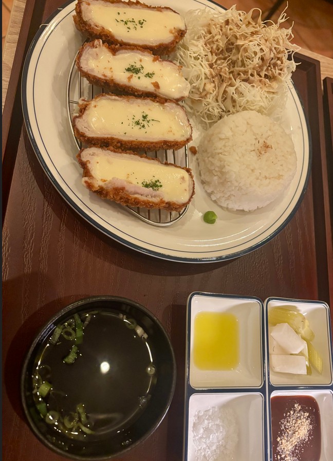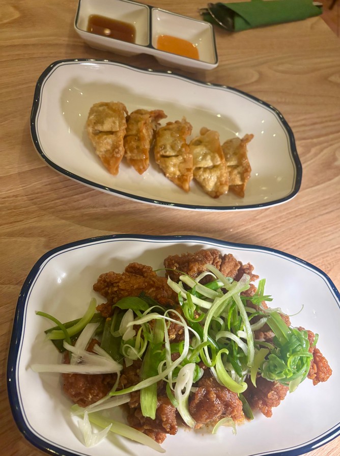 „Oh nein!“, denken wir, „Nicht schon wieder diese blöden Piepser am Tisch!“ Sekunden später werfen wir uns mental in den Staub. Diese Piepser sind dafür da, das Personal auf uns aufmerksam zu machen, man läutet wortwörtlich nach ihnen. Schon kommt jemand angeflitzt und nimmt unsere Bestellung auf – fabelhaft! Die Karte ist übersichtlich gestaltet. Drollige Illustrationen und kleine Fun-Facts („Dieses Bier mischen wir Koreaner gerne mit Soju-Schnaps. Frag uns nach dem richtigen Mischungsverhältnis!“) machen sie fast zu einer unterhaltsamen Lektüre. Nur mühsam entscheiden wir uns, obwohl die Karte nicht so groß ist wie bei vielen anderen Lokalen. Aber es klingt nun mal alles sehr lecker! Unsere Wahl fällt auf eine große Cola (5,50 Euro, 0,5l), koreanisches Bier und Soju (3,80 Euro und 3 Euro) – schmeckt spannend! Zur Vorspeise hätten wir gern Mandu (6,50 Euro) und eine kleine Portion Ganjang-Huhn (9 Euro). Bei Mandu handelt es sich um fünf Teigtaschen, die frittiert werden. Dabei ist die Füllung wählbar: Shrimp, Tofu-Gemüse, Kimchi oder Bulgogi. Wir entscheiden uns für Letzteres – zum Thema Bulgogi kommen wir noch. Das Huhn wird paniert, frittiert und kann in mild und scharf bestellt werden, wir nehmen natürlich scharf. Und siehe da: Als wenig später serviert wird, finden wir kleine Chilischoten in der süß-scharf-klebrigen Sauce, die wir begeistert mitessen. Auch das Hühnchen ist klasse. Hörbar knusprig, innen aber saftig. Der Teigmantel ist würzig, aber nicht auf chemisch-schmeckende Art. Auch die Portion ist gut gewählt und dem Preis durchaus angemessen. Die Mandu werden mit einer scharfen Sojasauce und Sriracha-Mayo serviert, sind außen knusprig und durch die fein pürierte Füllung würzig und saftig. Extrem gut! Unsere Hauptgänge bestehen aus Käse-Donkatsu (18,50 Euro) und dem sagenumwobenen Bulgogi (17 Euro). Das ist im Grunde eine Art Barbeque-Marinade. Es gibt sie in süß-würzig und scharf-würzig für jede Art von Fleisch, klassisch – und hier auch so angeboten – ist aber das süß marinierte Rindfleisch. Es ist hauchdünn geschnitten, fast wie Carpaccio, und bei großer Hitze sehr schnell gegart, so dass es ein leichtes Raucharoma entwickelt. Hier ist es, und ja, das ist ein großes Wort, genial. Buttrig, rauchig und würzig – schwer vorstellbar, das besser machen zu können. Absolute Empfehlung! Serviert wird es mit Reis, einer Tasse Katsobushi-Suppe und sauer eingelegtem Gemüse (hier Gurke und Spinat). Beim Käse-Donkatsu handelt es sich um eine Schweinekrokette mit Käsefüllung, die in Scheiben geschnitten wurde. Wie ein Cordon Bleu ohne Schinken, stattdessen aber mit dreifach Käse – unglaublich befriedigend zu essen. Auch dazu gibt es Reis, einen tollen Kohlsalat, eingelegtes Gemüse (Rettich und Sellerie), Wasabi, Maldon-Salz, Trüffelöl, Donkatsu-Sauce (etwa wie fruchtiger Ketchup mit Worcestershire-Sauce) und Katsobushi-Suppe. Letztere ist eher eine Brühe aus getrockneten Bonito-Flocken (Makrelen-Thunfisch-Tier) und wirklich Geschmackssache, göttlich für einige, „Regentonne“ für andere. Sie ist aber sehr gut gemacht und eignet sich prima als Beilage. Wir sind satt. Wir sind begeistert. Und wir werden so was von wieder kommen, denn die Fisch-, vegetarischen und veganen Gerichte wollen schließlich auch probiert werden!