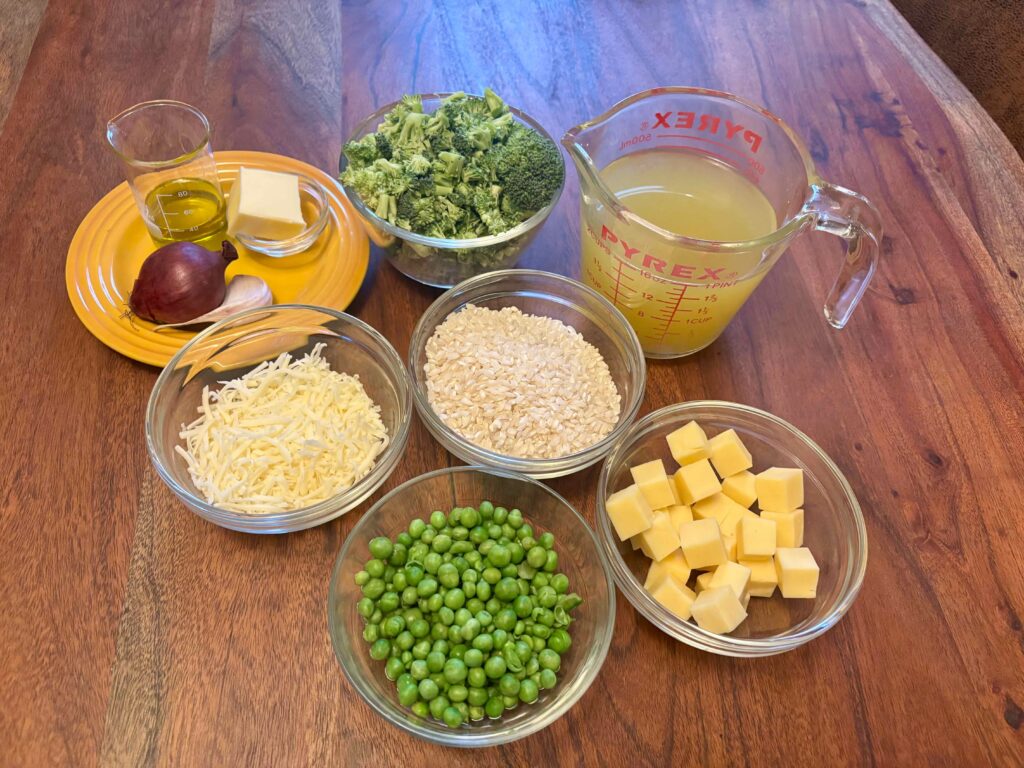 Wir brauchen 250 g Risotto-Reis, zum Beispiel Arborio, einen Liter Gemüsebrühe, eine Zwiebel, etwas Knoblauch (beides fein gehackt), Butter und Olivenöl. In einem Topf schmelzen wir die Butter, fügen erst das Olivenöl und dann den Reis hinzu, lassen ihn ein bisschen Farbe nehmen, ehe Zwiebel und Knoblauch dazukommen. Das hat nichts mit dem sagenumwobenen „das Korn versiegeln“ zu tun, das ist nämlich Quatsch, es geht nur um den Geschmack. Körner zu rösten, macht ihren Geschmack „getreidiger“ und somit intensiver. Schrittweise geben wir die Brühe dazu und kochen die ganze Lumumpe, bis ein ordentliches Risotto dabei herauskommt. Jetzt findet ein kleines Glas Pesto alla Genovese seinen Weg in den Topf. In den letzten fünf Minuten ergänzen wir um 250 g fein gehackten Brokkoli und 75 g grüne Erbsen. Wir würzen final mit weißem Pfeffer und Muskat (Salz sollte durch die Brühe und das Pesto ausreichend sein), ehe wir 100 g geriebenen Mozzarella unterrühren. Das fertige Risotto streichen wir nun glatt in eine Form, lassen es abkühlen und ein paar Stunden im Kühlschrank stehen.