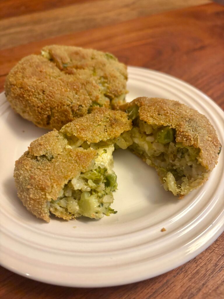 Jetzt bauen wir eine klassische Panierstraße auf: Mehl, 2 verquirlte Eier, Paniermehl. Außerdem brauchen wir noch etwa 100 g Käsewürfel – welcher Käse, ist Geschmackssache, was eben gefällt, aber je mehr Fäden er zieht, desto spaßiger. Die erkaltete Risottomasse teilen wir Pi mal Auge in 20-25 Stücke und rollen sie zu Bällchen (die Größe liegt irgendwo zwischen Golf- und Tennisball), in deren Mitte ein Stückchen Käse steckt. Am besten geht’s mit Handschuhen, leicht angefeuchtet. Kleiner Disclaimer: Es macht keinen Spaß, da will ich gar nichts anderes behaupten. Aber es lohnt sich. Die Bällchen werden jetzt ein bisschen flach gedrückt, mehliert, dann in Ei und schließlich in Paniermehl gewälzt, bevor wir sie ausbacken. Am elegantesten geht das natürlich in einem Airfryer, etwa 22 Minuten bei 180 Grad, aber sie lassen sich auch gut mit ausreichend Fett in der Pfanne braten. Das dauert weniger lang, vielleicht 4-5 Minuten pro Seite, denn die Füllung ist ja im Grunde genommen schon gar. Hier empfiehlt sich Butterschmalz, Rapsöl oder ein ähnliches Fett, das hohe Tempe raturen gut verträgt. Olivenöl wird ab einer gewissen Temperatur bitter, das wäre ja schade. Und klar: Im guten alten Backofen geht‘s natürlich auch: Auf 200 Grad Ober-/Unterhitze vorheizen (Blech mit vorheizen!), die Knubbel rauf aufs Blech, die Oberseite mit Öl bepinseln oder besprühen, zehn Minuten backen, wenden, wieder pinseln/sprühen und noch mal 7-8 Minuten ins Rohr. Das Rezept ergibt, wie erwähnt, 20-25 Supplì. Damit kriegt man locker 6 Leute satt. Allerdings lassen sie sich auch prima einfrieren und bei Bedarf hervorholen.