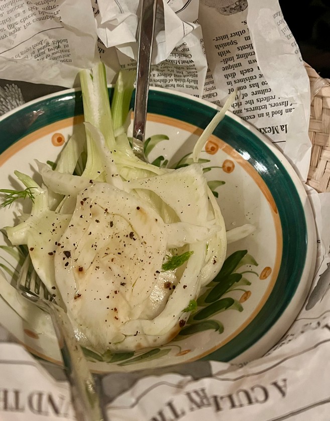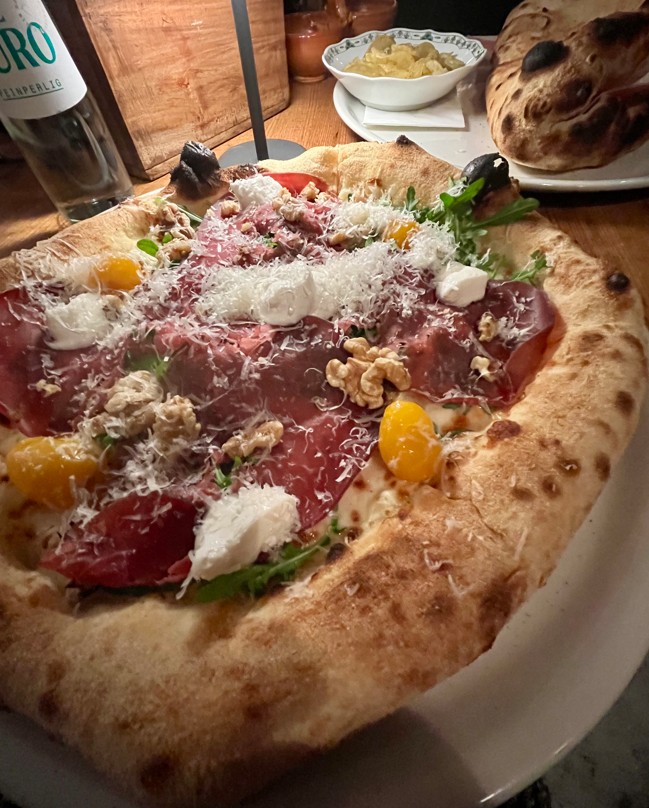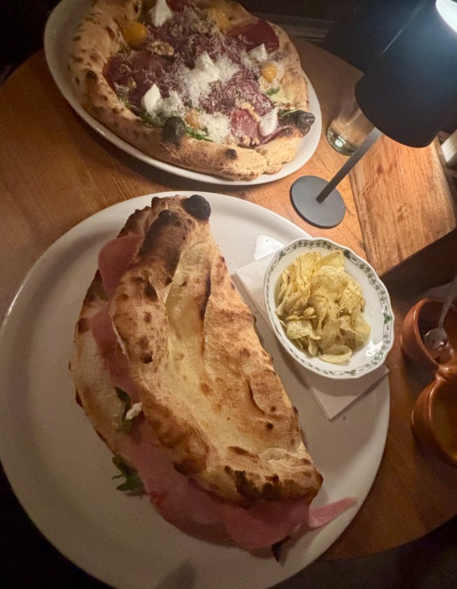 Ein kleiner Laden, gemütlich vollgestopft mit italienischer Deko, die sich die Aufmerksamkeit mit einem Wandgemälde teilt, das einen als Cowboy verkleideten und mit Bananen bewaffneten Affen zeigt. Dazu tönt 70erjahre Disco-Soul aus den Boxen. Nett! Bestellt wird über einen QR-Code, der den jeweiligen Tischen zugewiesen ist. Wir entscheiden uns für eine Flasche Grapefruitlimonade und ein Wasser (3,50 bzw. 2,50 Euro), für eine Pizza Bresaola mit zusätzlichen Artischocken (14,90 Euro plus 2 Euro) und ein Tacchino Panuozzo (11,90 Euro). Schon bald erhalten wir unsere Getränke sowie eine Schale, die uns als Salat präsentiert wird, als Gruß aus der Küche. Streng genommen ist dieser Salat roher Fenchel, der etwas angemacht wurde. Schmackhaft, aber zu dick geschnitten um sich gut verzehren zu lassen. Doch kurz danach kommen schon die Hauptgerichte, die, das lässt sich nicht leugnen, eindrucksvoll aussehen.