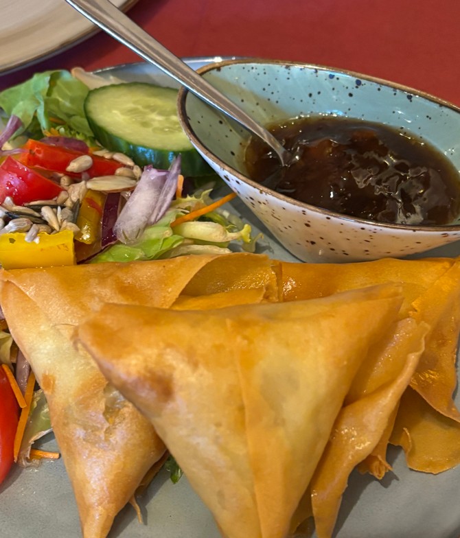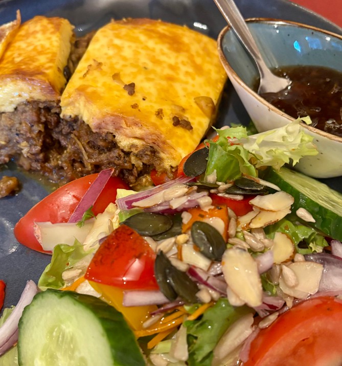Als Vorspeise bestellen wir uns Samosas mit Lammfüllung (3 Stück 7,90 Euro). Richtig gut! Der Teig ist blättrig, sehr knusprig und die Füllung aus Lammhack und Erbsen ist toll gewürzt, das Aprikosenchutney passt sehr gut dazu. Daneben finden wir eine frische Salatbeilage mit Dressing – aber nicht zu viel – und Saatengarnitur. Alles in allem ein exzellentes Entrée. Beim Hauptgang sind wir unschlüssig. Ja, sicher, Zebrafleisch ist exotisch und alles, aber wir haben keine Vergleichsmöglichkeiten. Wir können sagen: schmeckt oder schmeckt nicht. Ganz subjektiv – wenig repräsentativ also. Nein, wir machen das anders. Bei Bobotie (14,50 Euro) handelt es sich um ein südafrikanisches Nationalgericht, das mit uns durchaus bekannten Zutaten hergestellt wird: Eine stark gewürzte, mit Aprikosen verfeinerte Masse aus Hackfleisch und eingeweichtem Weißbrot, die mit einer Haube aus Eiern und Sahne bedeckt und gegart wird. Im Grunde Hackbraten mit Mütze. Die starken Gewürze, besonders Zimt kommt hier deutlich zum Ausdruck, und die Süße der Aprikose harmonieren sehr gut miteinander. Ein richtiges Wohlfühlgericht, das man am liebsten mit einem großen Löffel einstrudeln möchte. Auch zum Bobotie wird eine Salatbeilage serviert, was Sinn ergibt, denn ohne wäre das Gericht vielleicht zu schwer und mächtig – Fresskomaalarm wegen lecker.